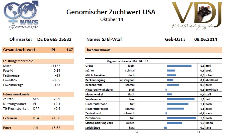 | | | Junger hornloser Deckbulle mit hohem genomischen Zuchtwert | 04.11.2014 | | | Im Angebot ist ein interessanter hornloser Irwin-Sohn Namens SJ El-Vital aus der berühmten Brendon-Tochter Evita PP. Der Bulle ist fünf Monate alt und hat sehr gute genomische Zuchtwerte vorzuweisen, wie Sie dem folgenden Datenblatt entnehmen können. El-Vital wird eine gute Milchleistung mit einem fehlerfreien Exterieur und guten Eutern vererben. Auch in den Fitnessmerkmalen vererbt er ausnahmslos positivg.