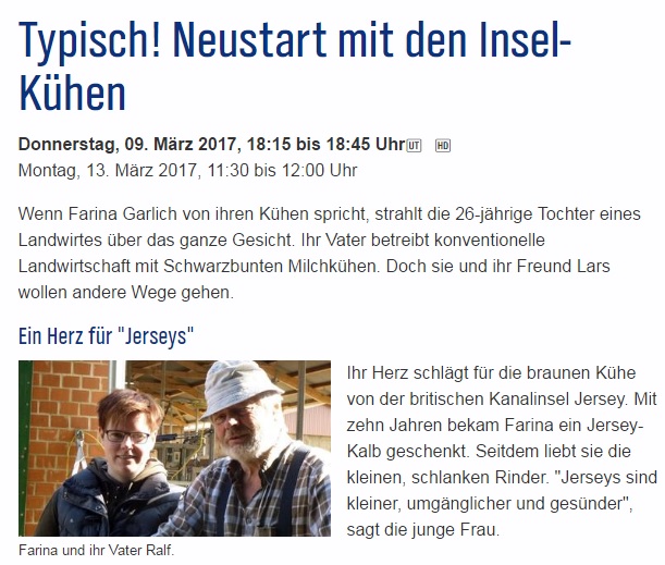 | | | Fernseh-Tipp für die nächste Woche | 28.02.2017 | | | Im NDR wird am nächsten Donnerstag eine Reportage über die Jerseys der Familie Garlich aus Bramsche ausgestrahlt. Alle Mitglieder die bei der Versammlung im letzten Jahr anwesend waren, konnten schon live dabei sein, bei den Aufnahmen des NDR-Teams.
