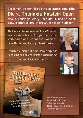 Am 19. und 20. September 2014 findet die zweite Auflage der offenen nationalen deutschen Jerseyschau "THURINGIA JERSEY OPEN" anlässlich der "Grünen Tage" in Erfurt statt.